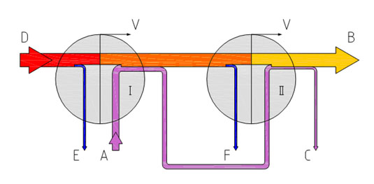 在多效蒸發(fā)裝置中,由新蒸汽加熱第一效產(chǎn)生的蒸汽不進入冷凝器,而是作為第二效的加熱介質得以再次利用。這樣可以將新蒸汽消耗有效降低約50%。重復利用此原理,可進一步降低新蒸汽消耗。第一效的最高加熱溫度與最后一效的最低沸點溫度形成了總溫差,分布于各個效。結果,每效溫差隨效數(shù)增加而減小。所以為達到指定的蒸發(fā)速率必須增大加熱面積。初步估算表明,用于所有效的加熱面積隨效數(shù)成比例增加,這樣一來蒸汽節(jié)省量逐漸減少的同時,投資費用顯著增加。